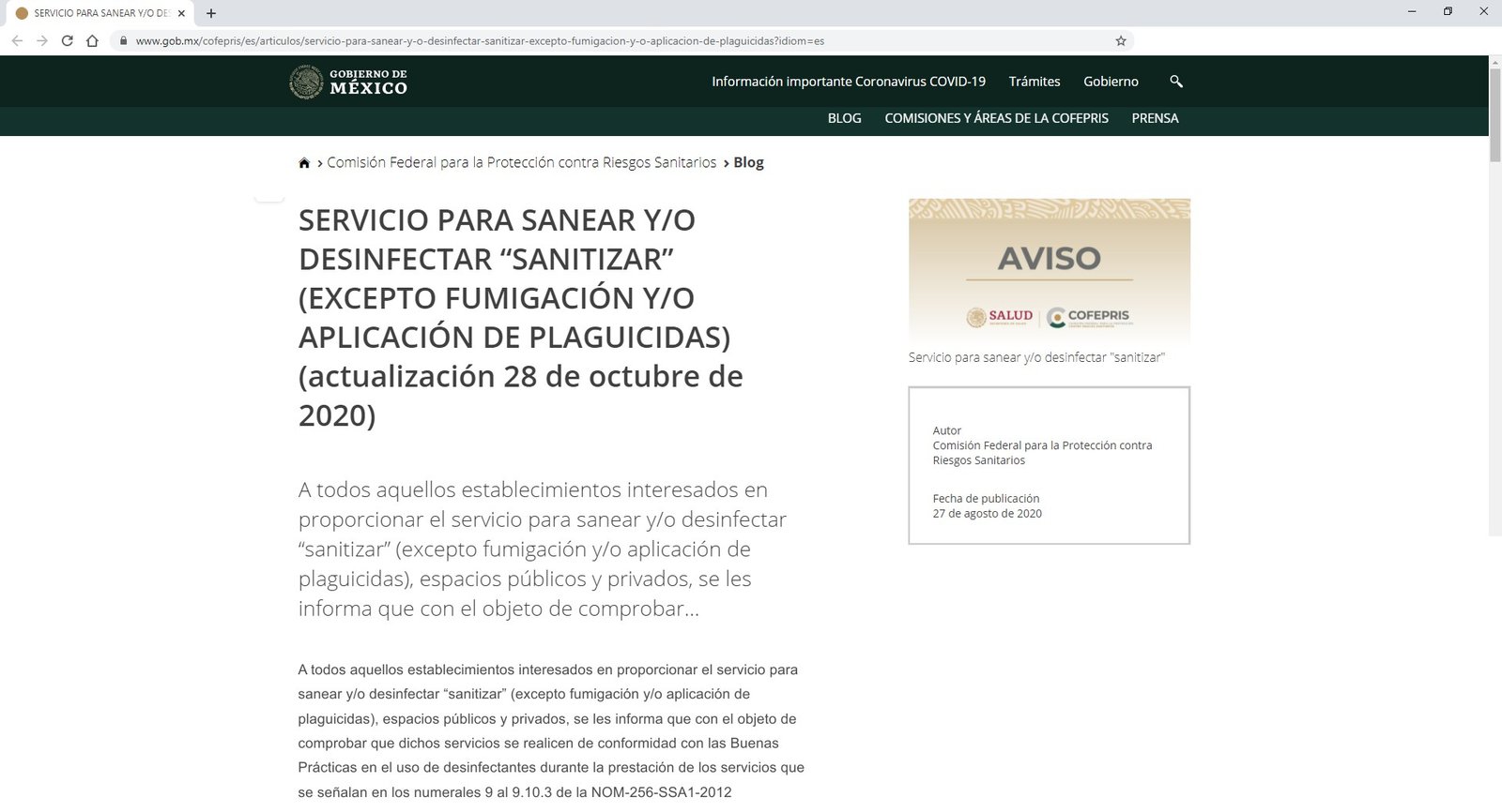 A todos aquellos establecimientos interesados en proporcionar el servicio para sanear y/o desinfectar “sanitizar” (excepto fumigación y/o aplicación de plaguicidas), espacios públicos y privados, se les informa que con el objeto de comprobar que dichos servicios se realicen de conformidad con las Buenas Prácticas en el uso de desinfectantes durante la prestación de los servicios que se señalan en los numerales 9 al 9.10.3 de la NOM-256-SSA1-2012 Condiciones sanitarias que deben cumplir los establecimientos dedicados a los servicios urbanos de control de plagas mediante plaguicidas, deberán presentar bajo escrito libre ante esta Comisión Federal para la Protección contra Riesgos Sanitarios a través de su Centro Integral de Servicios (CIS) ubicado en Oklahoma 14 Colonia Nápoles, Alcaldía Benito Juarez , Código Postal 03810, Ciudad de México la siguiente documentación:
